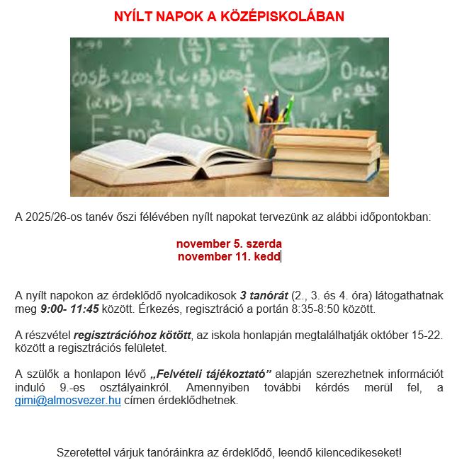 Szeretettel várjuk Önöket nyílt napjainkra, amelyek az alábbi időpontokban lesznek.